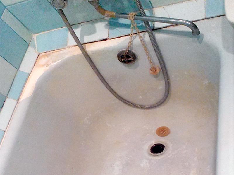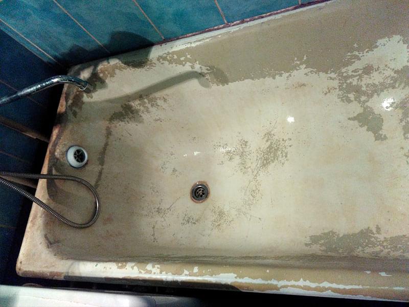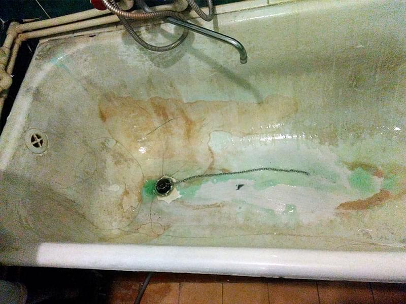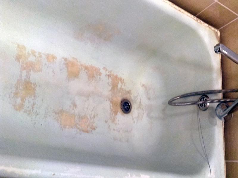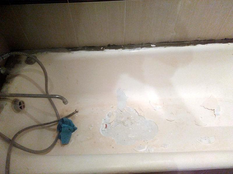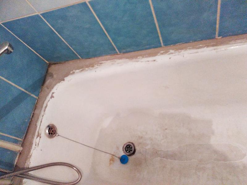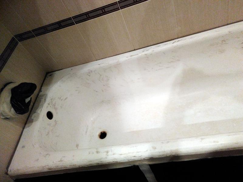 Если ванна реставрировалась ранее, старое покрытие нужно ПЕРЕ ЗАЧИСТИТЬ. Иначе новый слой повторит все существующие неровности, а в будущем может начать отслаиваться. Удаление эмалевого слоя занимает от 1 до 3-х часов. Работы пыльная — советуем заранее закрыть все поверхности в ванне.