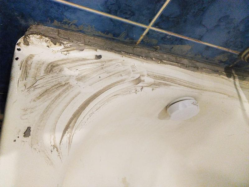 Эти работы проводим перед зачисткой и нанесением акрила. Заделываем щель цементной или гипсовой смесью, после заливаем всю поверхность. В результате ванна становится более герметичной и в большинстве случаев отпадает необходимость в бордюрах. Если плитка выложена выше ванны, он все-таки понадобится.